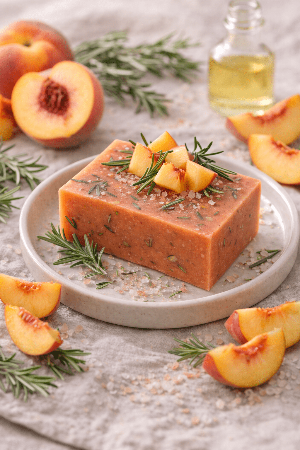 Ingrédients : Huile d'olive, huile de coco, huile de pépins de raisin, huile essentielle de romarin, fragrance pêche, extrait de pépins de pamplemousse, ocre rouge et jaune
