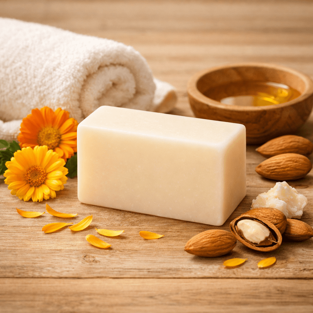 Le macérat de fleur de calendula, sublime l'huile d'amande douce et le karité, afin de vous porposer un savon tout en douceur, sans parfum.