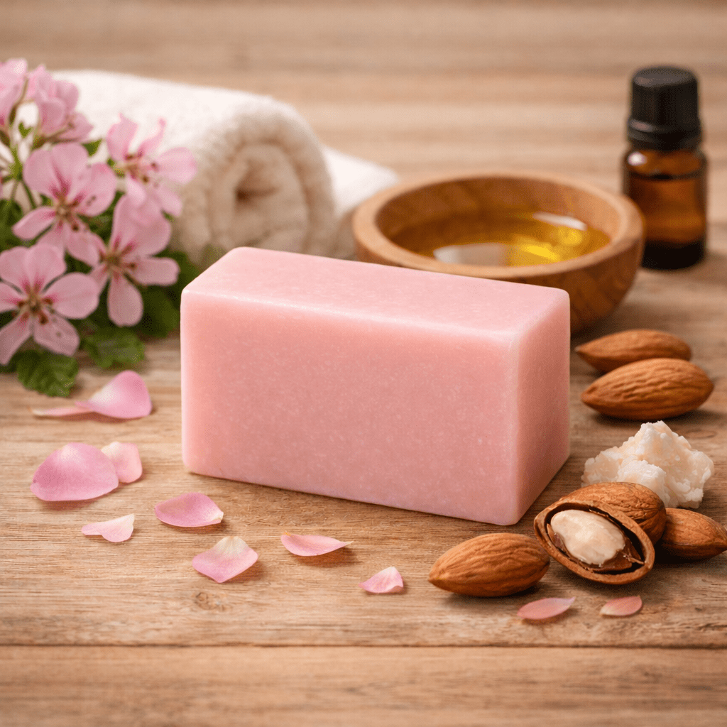 INCI : Sodium Calendula Officinalis Flower Oil, sodium cocoate, , Sodium Sweet Almondate , Sodium Shea Butterate, Glycerin, Aqua, Cymbopogon Martini Oil , Citrus grandis seed extract, Ascorbic acid, Géraniol*