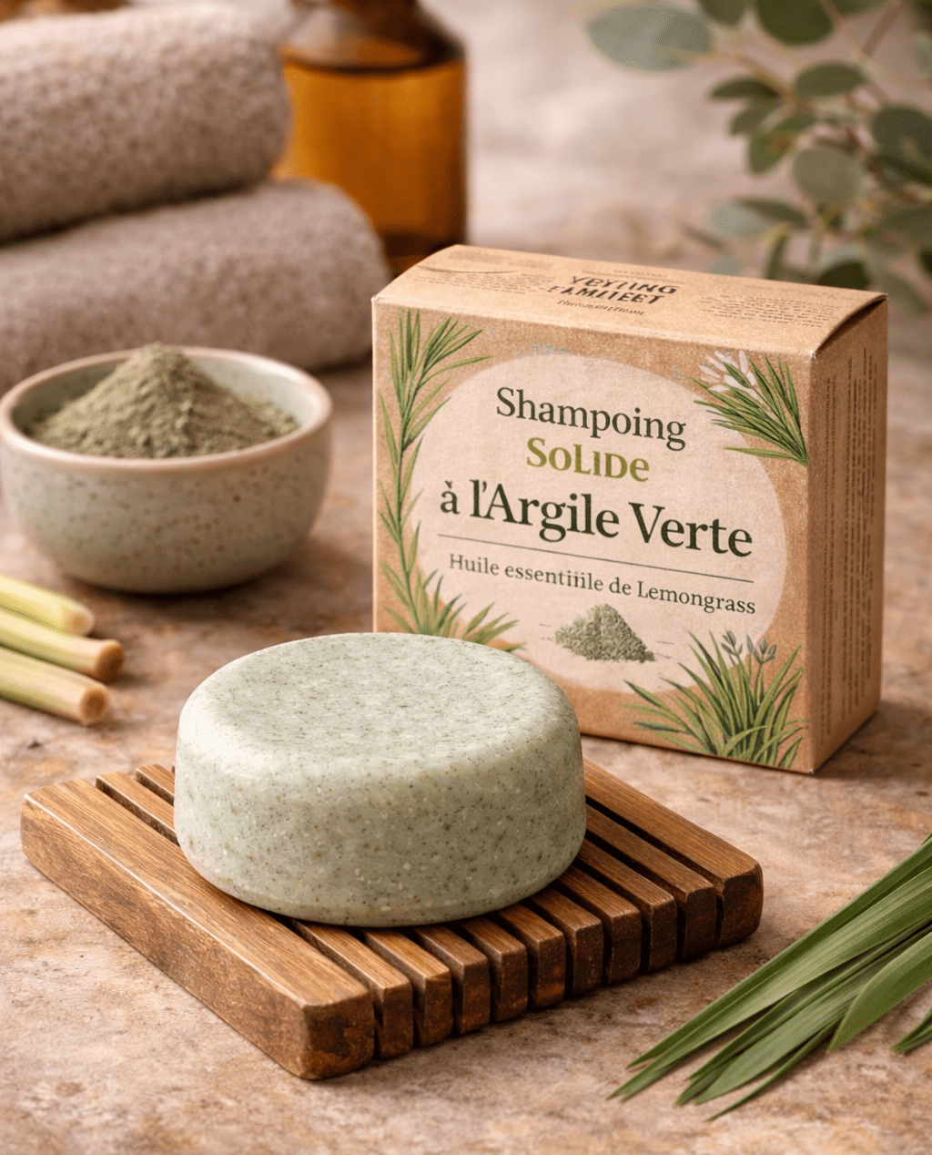 Ingrédients en français : Huile d'olive, huile de coco, huile de ricin, huile essentielle de lemongrass, Argile verte, protéines de riz, extrait de pépins de pamplemousse
